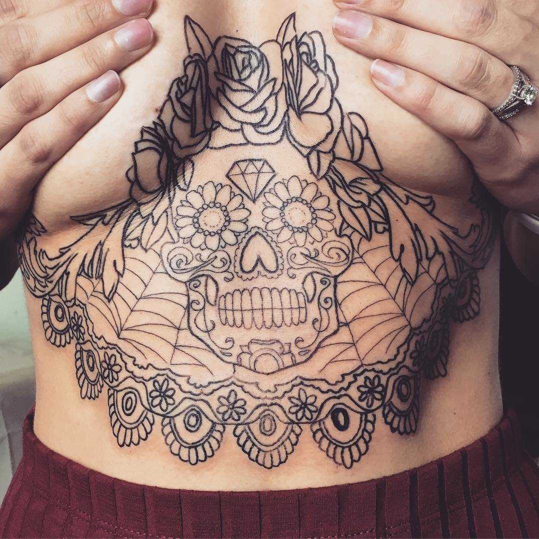 Набивать тату на передней части женского торса можно над грудью и под ней. Необычно выглядят миниатюры, огибающие грудь сбоку. Но это довольно болезненная процедура, а сама тату окажется в слепой зоне.