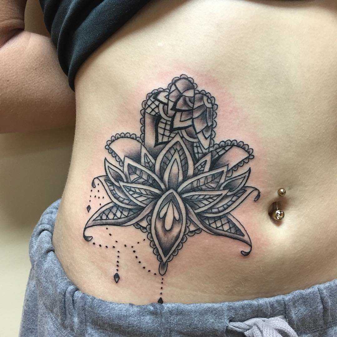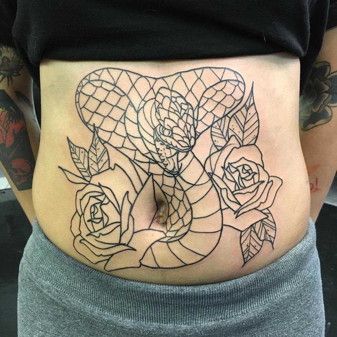 Женский животик придается разукрашиванию довольно редко. Массивных рисунков практически никто не делает, а вот что-то маленькое набить можно. Чаще всего это представители флоры, летающие насекомые или забавные рисунки в стиле неотрадишнл.