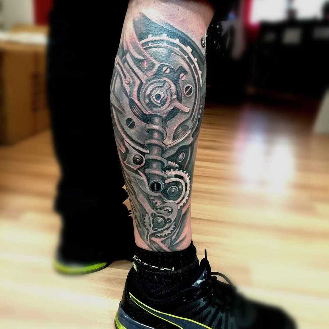 Хотя каждая биомеханическая татуировка на икрах отлична от другой, их общей чертой является сочетание органических и механических элементов. Обычно эскиз выглядит так, будто кожу человека содрали для того, чтобы обнаружить под ней механические элементы.