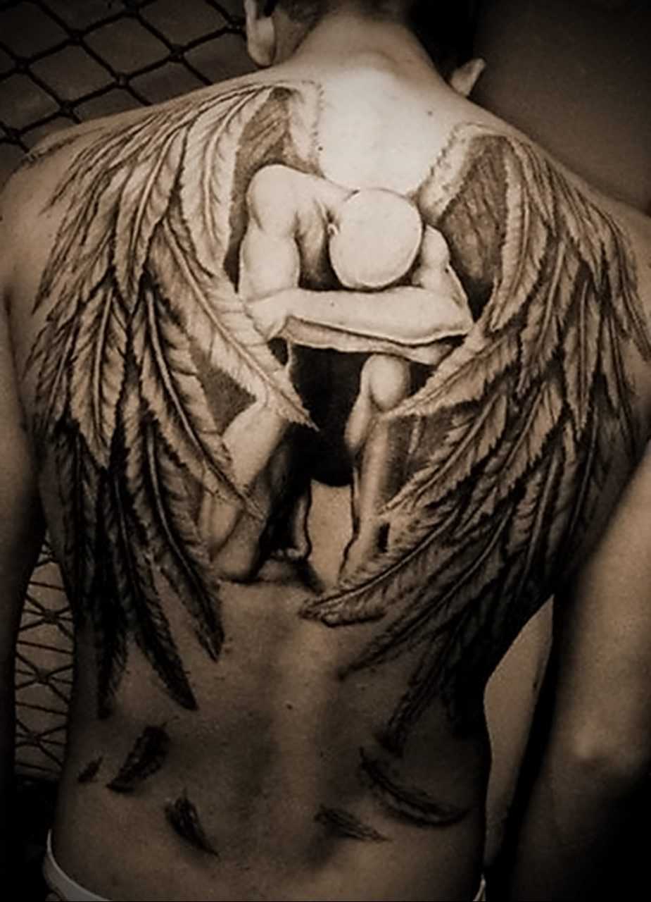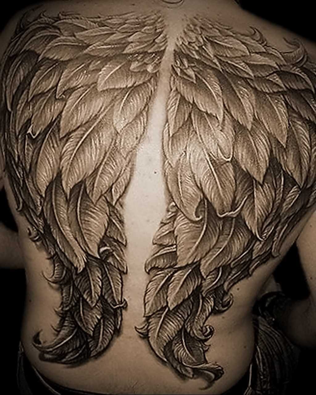 Крылья являются неотъемлемой частью ангела. Они делают этот образ узнаваемым и имеют свое особое значение. Расправленные крылья говорят о силе духа и веры. Сложенные или сломанные символизируют сомнения. Мужская тату в виде крыльев на спине может означать, что этот человек готов стать чьим-то ангелом-хранителем.