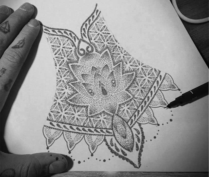 - Размер и сложность эскиза. Если в рисунке присутствует много тонких линий или слишком витиеватые элементы, это скажется на стоимости татуировки.