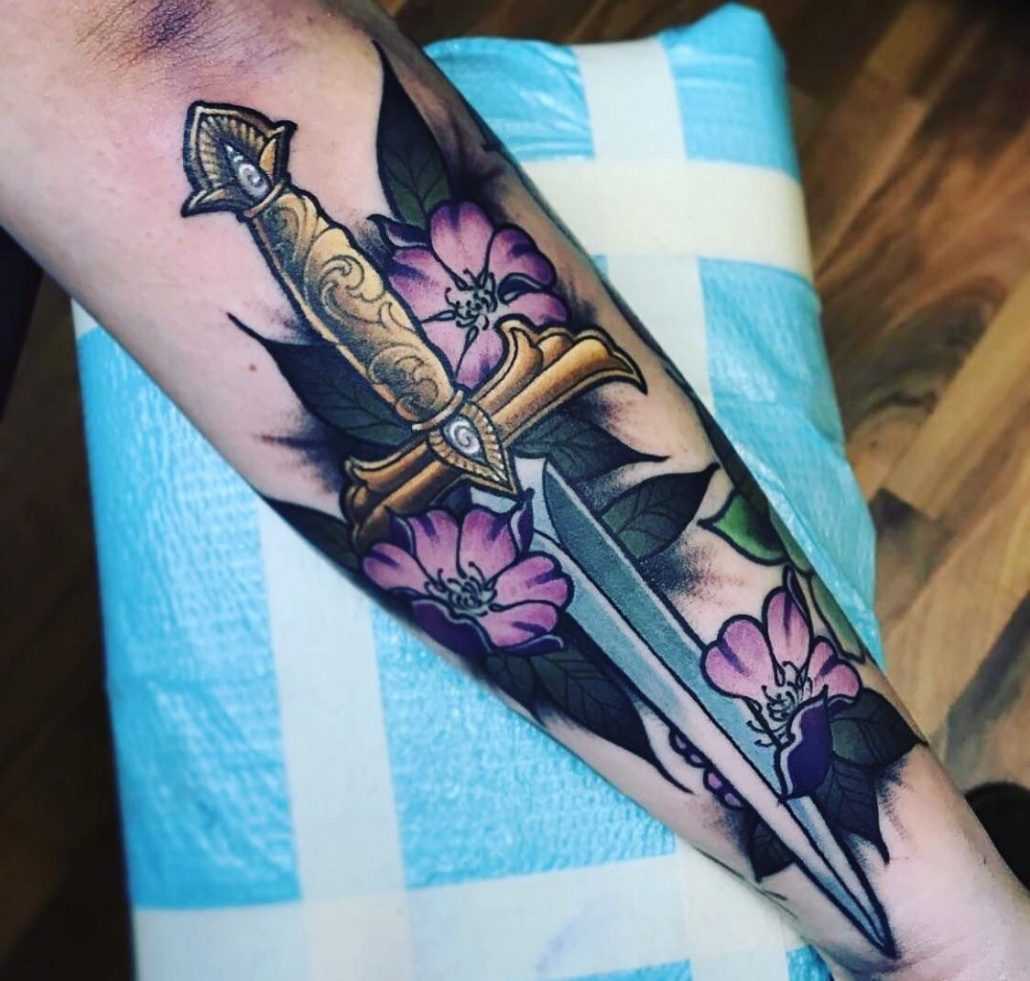 Татуировки с кинжалами и ножами. Как только вы видите кинжалы и ножи, первое, что приходит на ум – это агрессия. И это действительно так. Эти два дизайна распространены среди мужчин, которые любят выражать свою дерзость и силу.