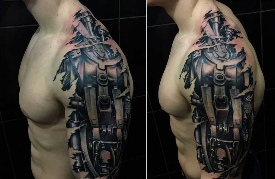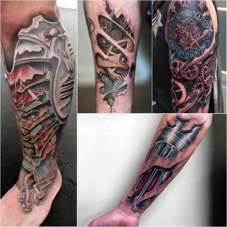 - Биомеханика – большие тату с мужскими узорами, подчеркивающие анатомию тела. Рисуются обычно по всей длине руки, ноги или на спине.