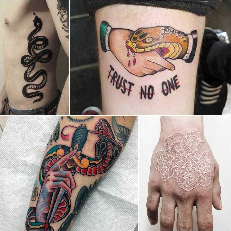 Чтобы воплотить в татуировке значение предательства можно обратиться к сюжету роза и нож. Также, аналогичной символикой обладает тату со змеей, например если змея кусает руку или у нее видны ядовитые зубы.