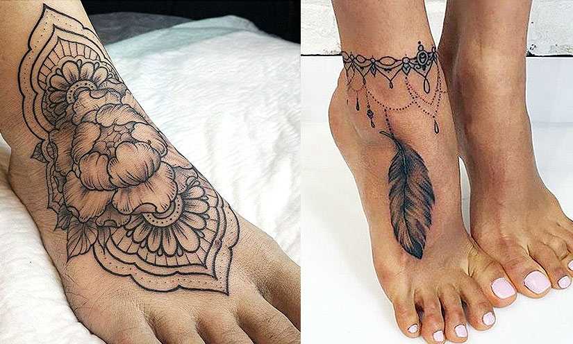 Стопа — достаточно оригинально, при желании вполне можно скрыть. Особенно интересно смотрятся народные орнаменты. Впрочем, на пятке рисунки не стоит размещать ввиду грубости кожных покровов — спустя время татуировка почти наверняка потеряет прежние очертания.