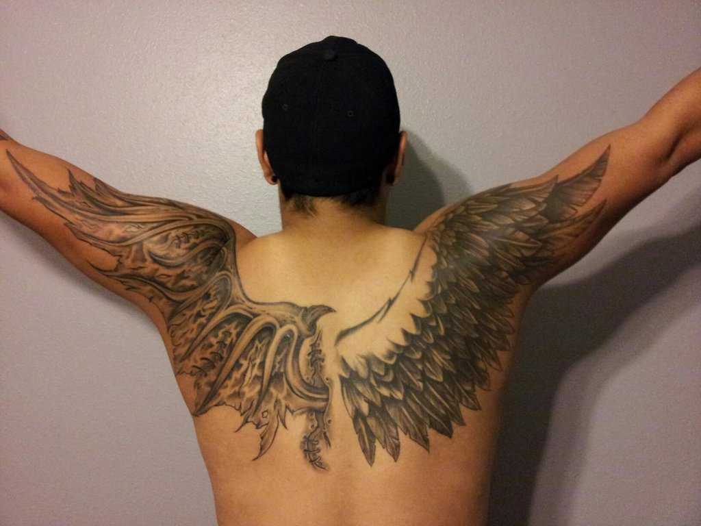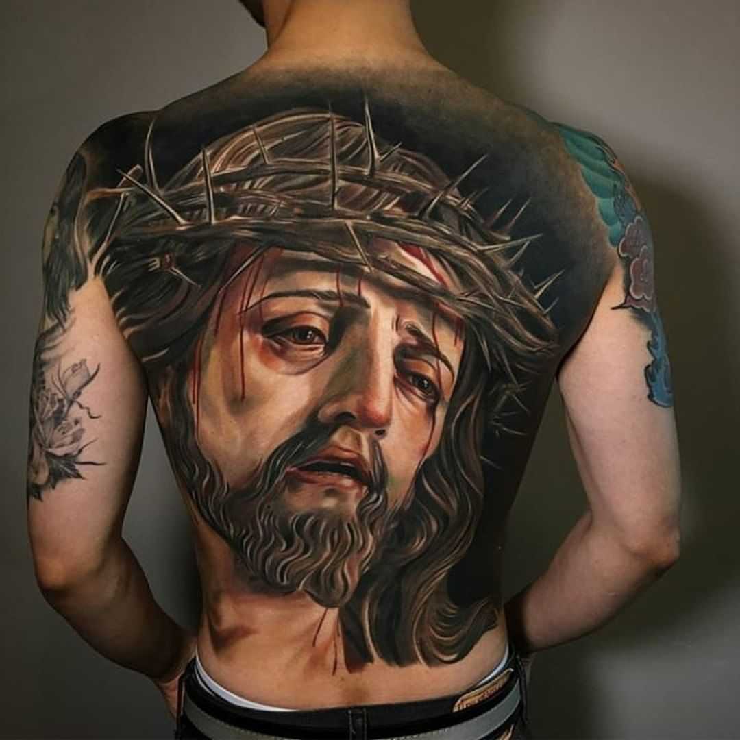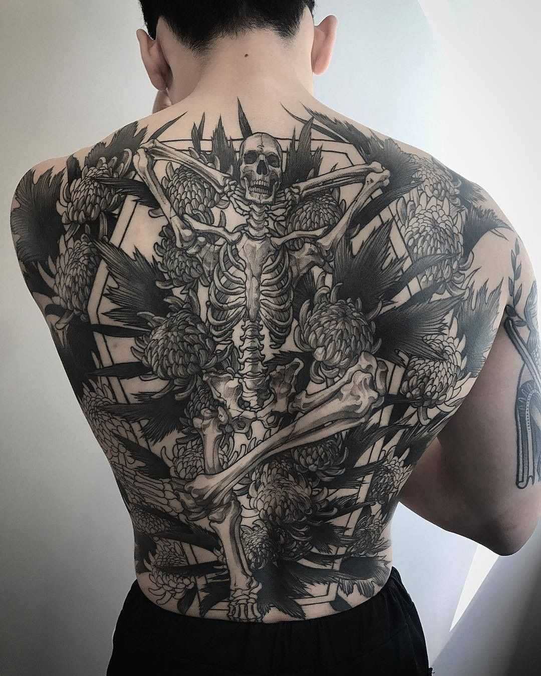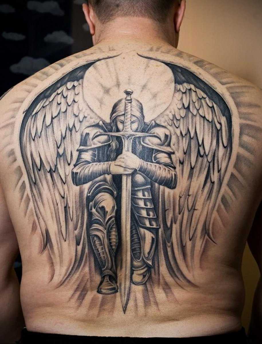Спина самое большое место для татуировки. На спину обычно наносят целые сюжетные картины, военные баталии или просто крупное изображение чего-либо. Из-за ровной поверхности спина удобнее всего для нанесения татуировки.
