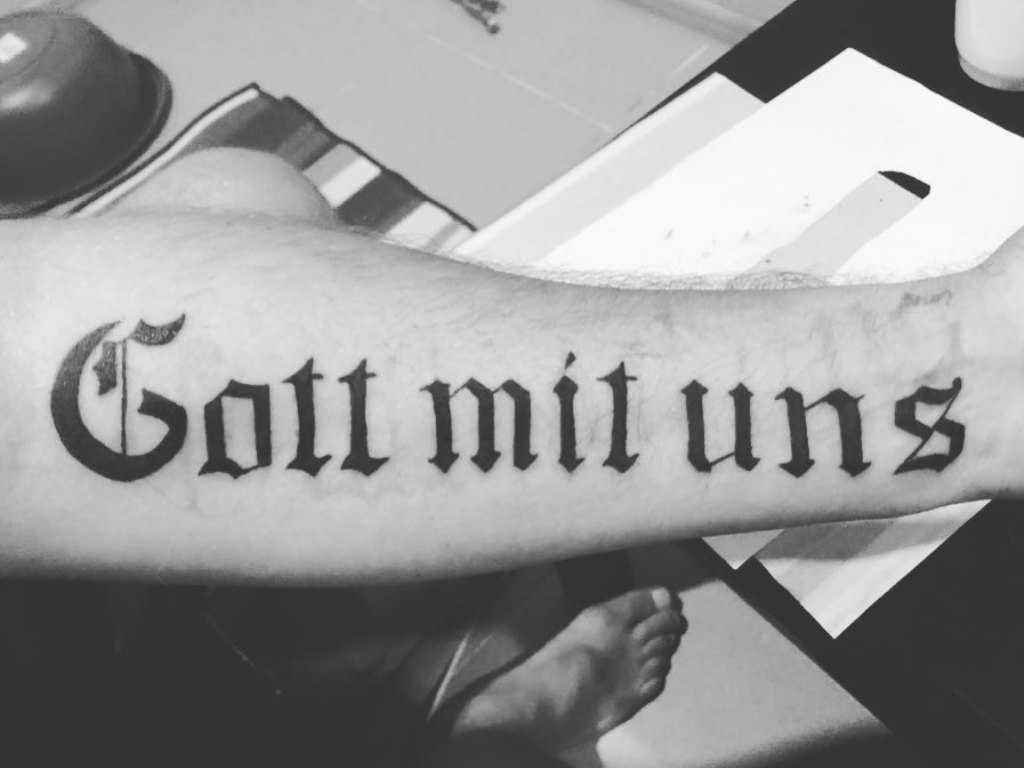 Чаще всего мужчины набивают надписи на латыни или английском языке. В каждую из них вложен конкретный смысл. Это могут быть цитаты из книг, фильмов или сериалов, красивые высказывания или просто слово, которое много значит для человека.