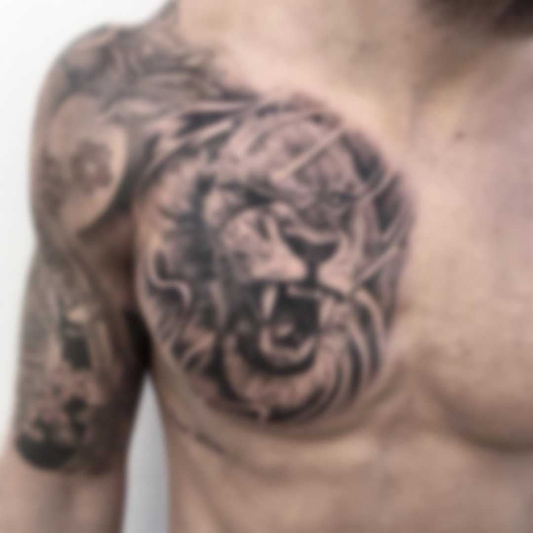 Для профессионального мастера грудь мужчины – отличный холст, на котором можно набить любые татуировки, независимо от их размеров. Например, крупного красивого тигра, изображение которого будет переходить на плечо.