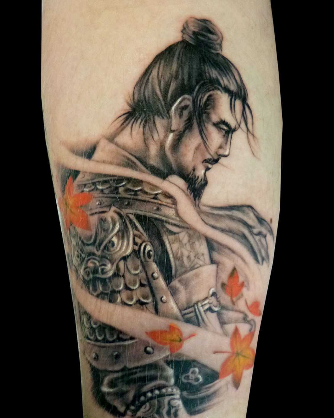 Татуха на плече парня – самурай и листья