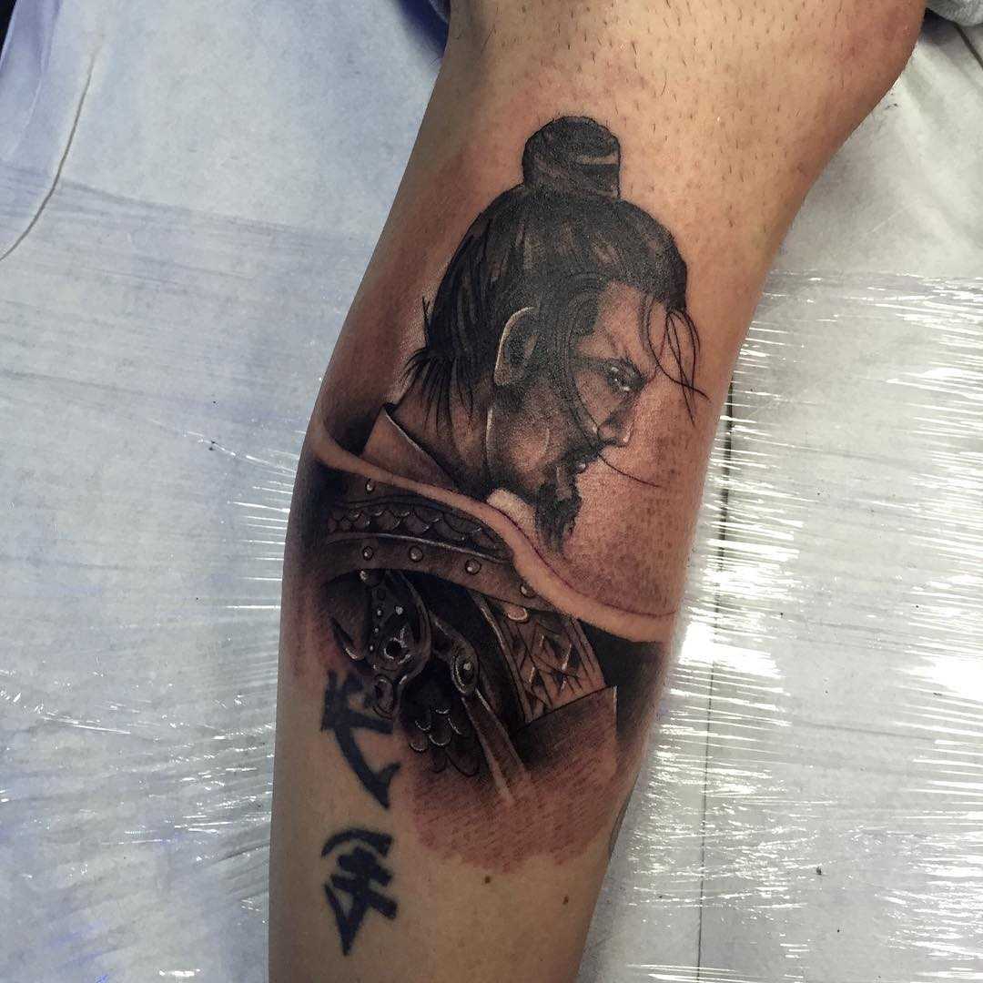 Татуировка на голени парня – самурай