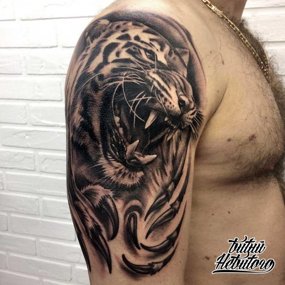 Голова тигра эстетично смотрится на сильном мужском плече, такая татуировка означает мужество и отвагу, готовность к бою в любой момент, мужскую честь и достоинство. Женщина всегда может опереться на это плечо, ведь перед ней смелый и достойный защитник семьи.