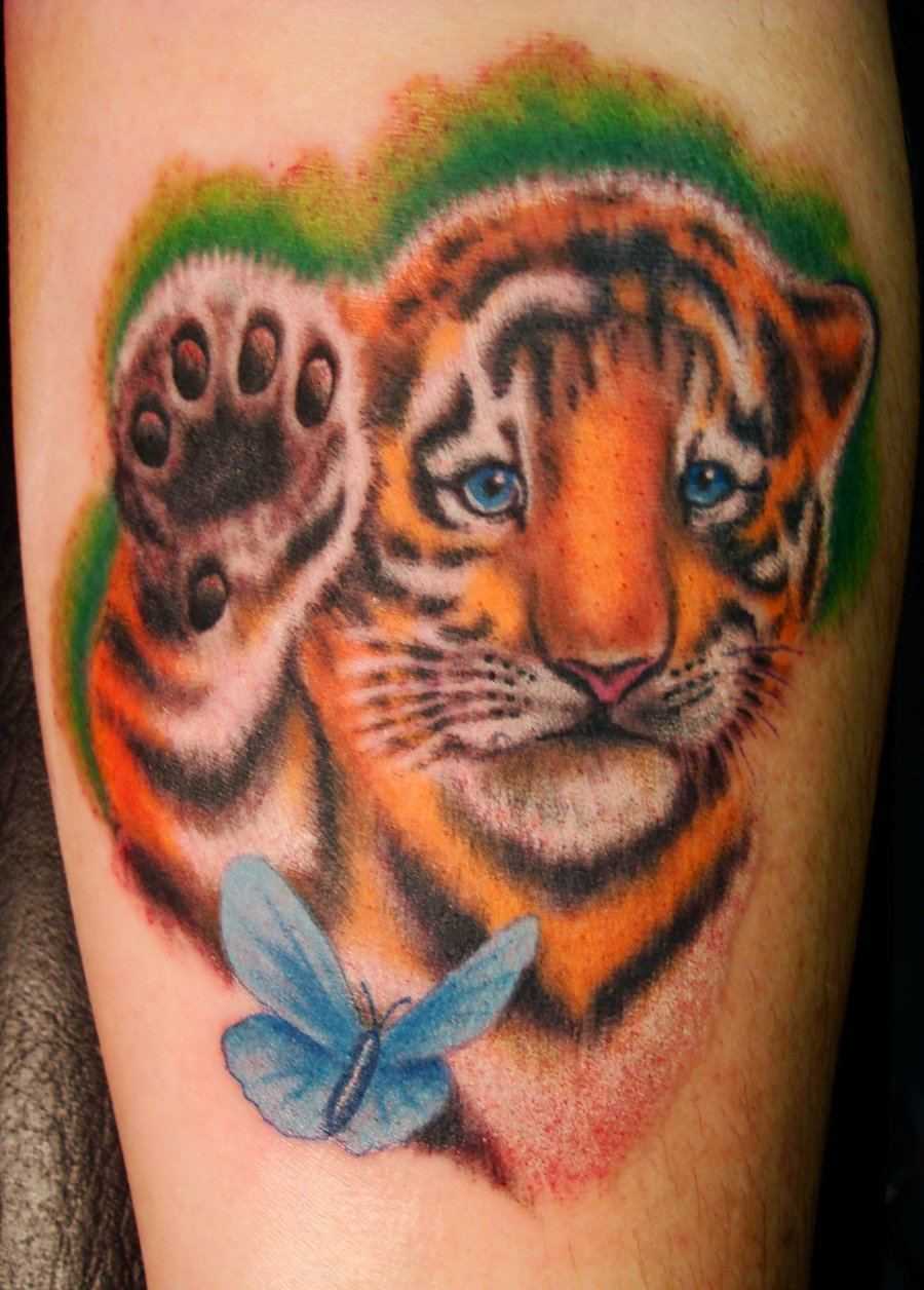 Маленький тигренок чаще всего появляется на коже женщин. Таким способом они стремятся подчеркнуть свою хрупкость и нежность. Кое-кто неосознанно не хочет разрывать свою связь с матерью. Об этом говорит изображение детеныша тигра на теле. Также девушкам свойственно выбирать сюжетные рисунки, где животное изображено на фоне цветов, камней, луны и других предметов.