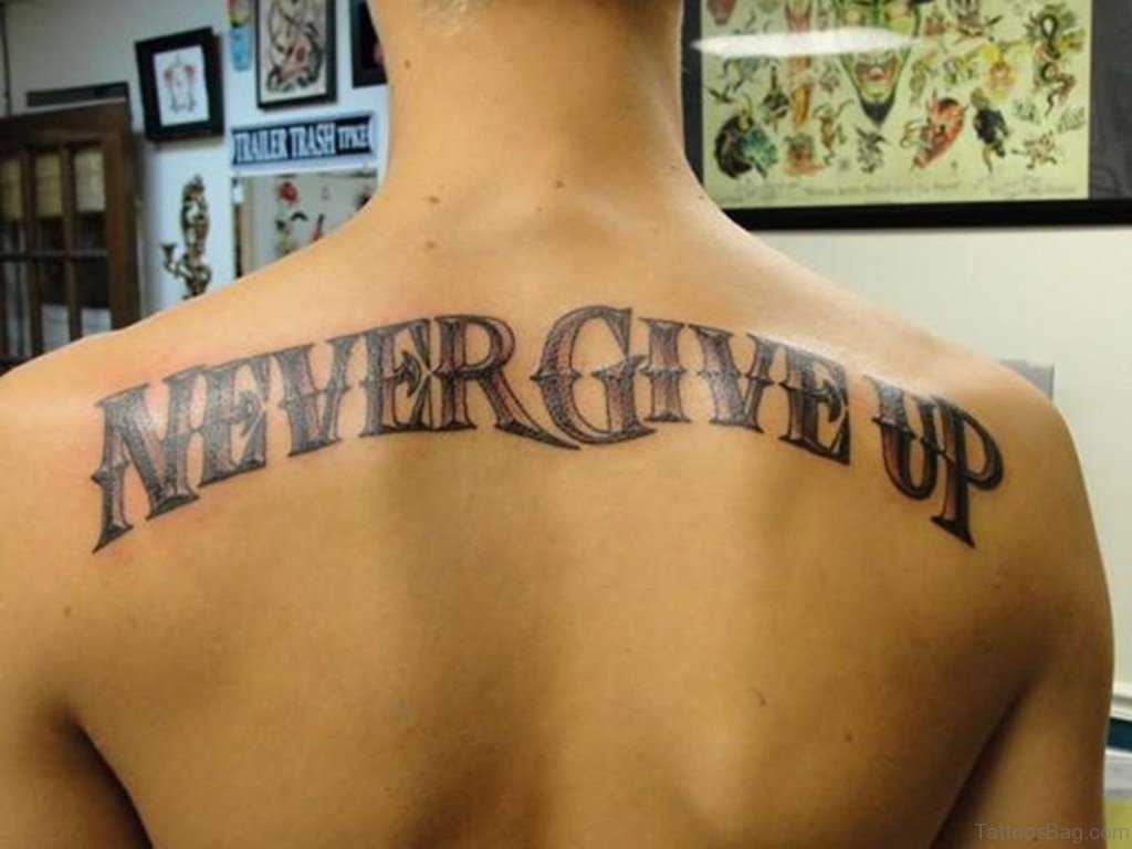 Огромное внимание в мужских татуировках надписях уделяется шрифтам, определенные фразы прописываются различными красками. Место на спине выбирается оптимальное, для мужчины чаще всего в верхней ее части