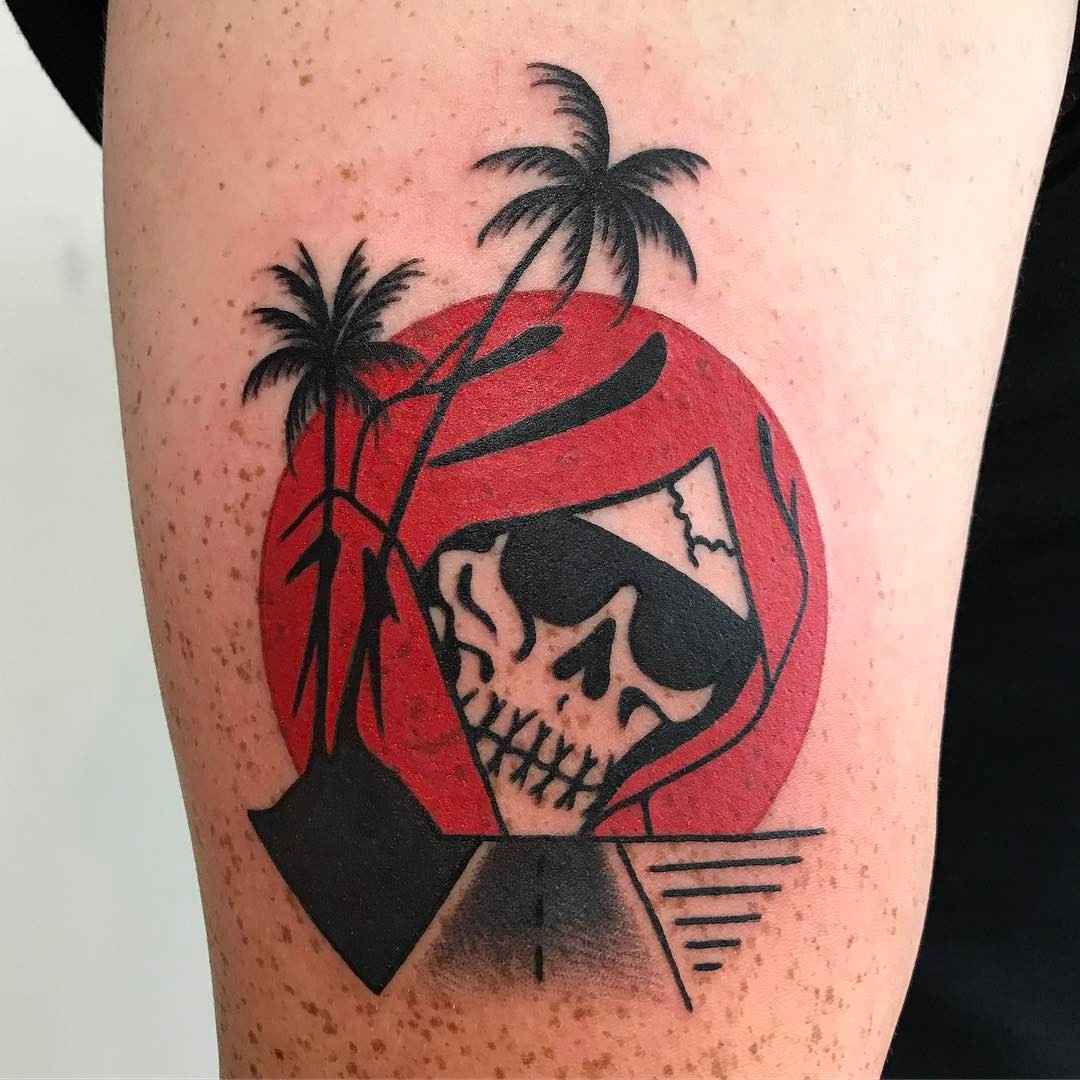 Череп и кости, а также разные виды оружия говорят о том, что человек не боится смерти. Он все о себе знает и относится к жизни с хорошей долей сарказма. Иногда такие мужские тату наносят в качестве оберега, чтобы смерть не могла застать врасплох, подкравшись со спины.