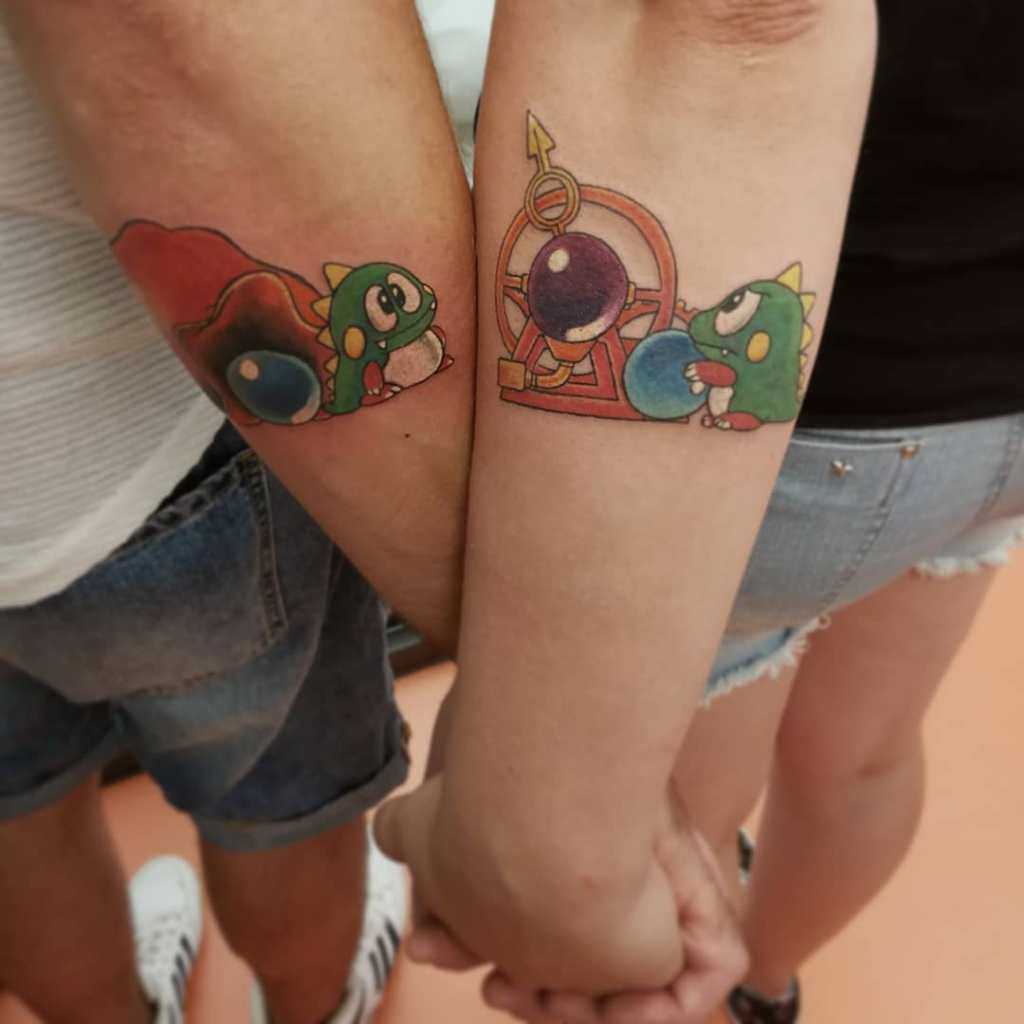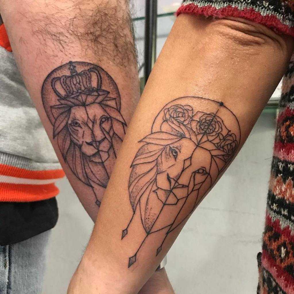 Тату в одном стиле, а также, тату со схожей тематикой подойдут парам, чьи вкусы в целом сходятся, однако, уникальность рисунка имеет значение. Сюжет может быть любым.