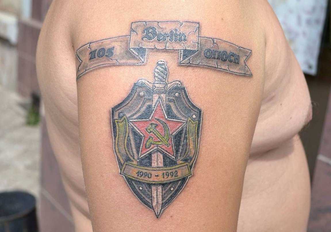 тату Набор пограничных войск олицетворяют знаки или, отличия нарукавные нашивки. Они служат цели практической — опознания человека в случае сложностей личности идентификации. На набор символов влияет род его и войск специализация. По татуировке можно узнать владельца историю, его заслуги во время несения армии.
