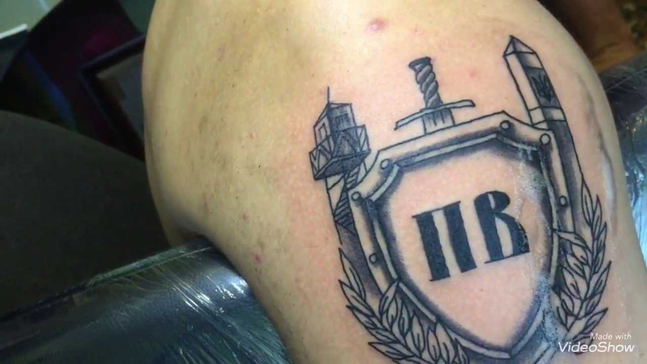 армейской Изображение тату многокомпонентное. Оно состоит из атрибутики характерной рода войск, эмблемы подразделения. К изображениям таким относят пограничный столб, полосатую или ленту буквы «ПВ».