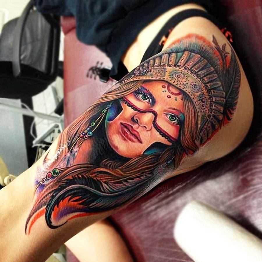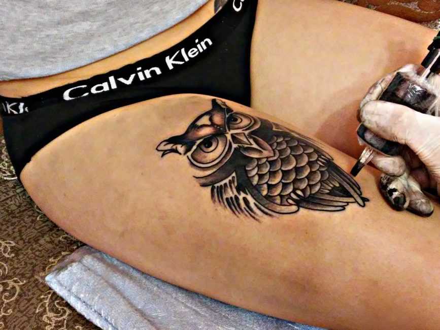 Татуировки на бедрах довольно популярны в 2018 году. Все больше девушек выбирают это место для изображения. Ляжку всегда можно погладить, рисунком полюбоваться и сделать прекрасные снимки. Чаще всего на этом теле изображают цветы или животных.