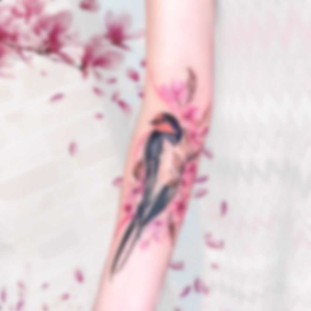 Изображение цветов особенно шикарно смотрится в акварельной технике, когда слегка размыт контур рисунка. Интересный вариант — комбинация акварельного тату с надписью, иероглифом.