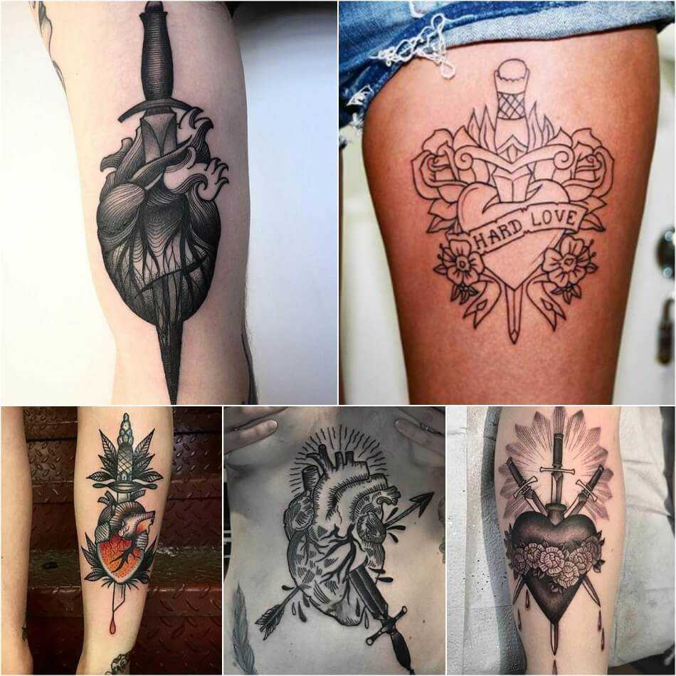 Сюжет татуировки, где кинжал пронзает сердце означает измену, предательство, потерю любви. Пораженное сердце символизирует боль, которую переживает человек, потерявший свои чувства.