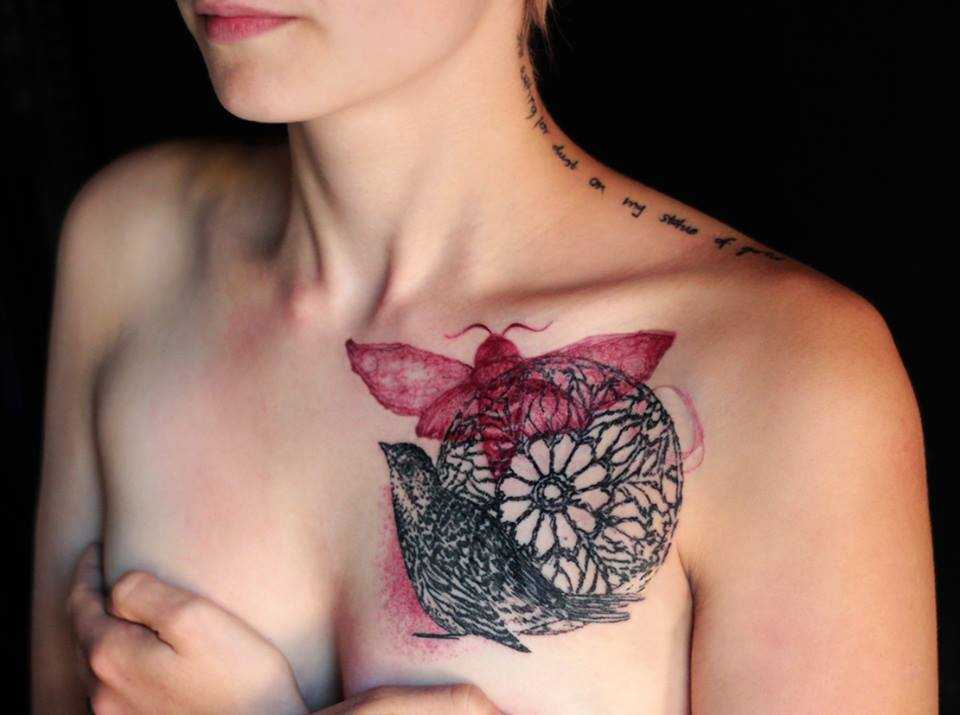 Кроме надписей в топе тату для ключицы находится изображение птицы. Она ассоциируется у большинства людей со свободой духа и независимостью. Это общие характеристики. Более подробные трактовки зависят от того, какая именно птица изображена на рисунке. Чаше всего сюжет с летящей птицей выбирают романтичные натуры, склонные к мечтам и пространным размышлениям.