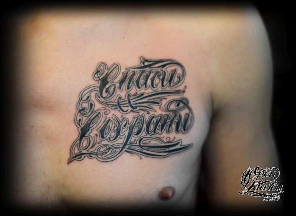 На груди и животе многие набивают год рождения. Девушки делают тату еще и под грудью, огибая текстом изгибы и формы. На боках и ребрах часто можно встретить татуировки по теме религии: молитвы, постулаты, заветы. Одна из самых частых: спаси и сохрани. На ключице изящно красуются женские мини тату с одним-двумя словами.
