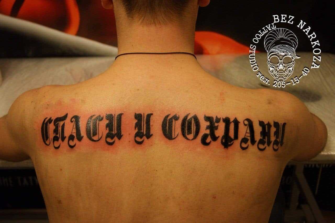 Так же тату надписи широко распространены в уголовных кругах. Их начали повально набивать в 90-х годах, когда в стране сохранялась накаленная криминальная обстановка. На зоне эти наколки набиваются на спине или на груди. Причем одним из самых распространенных эскизов является тату крест с надписью или текст на фоне церкви с куполами.