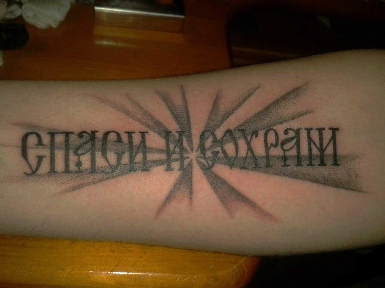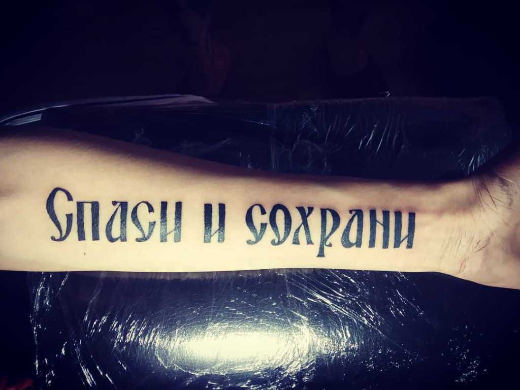 «Спаси и сохрани» тату на руке, написанное в разном стиле и с разного вида атрибутикой, воспринимается не как простое украшение. Обращение на руке о спасении связано с просьбой о защите, желанием уберечь душу от соблазна и греховных помыслов.