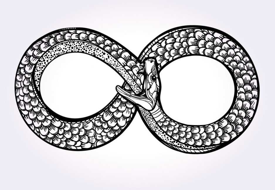 Древнейшее изображение, называемое Уроборос, было найдено в наскальных рисунках в Тибете. Он символизировал змею, проглатывающую собственный хвост. Мистический символ упоминается в древних легендах, установить место и время его появления не представляется возможным. Согласно легендам, змея пыталась проглотить свой хвост, но тот постоянно отрастал и процесс поедания продолжался до бесконечности. Уроборос — фигура, которая показывает, что за концом всегда следует новое начало. Он может отражать цикличность природных явлений.