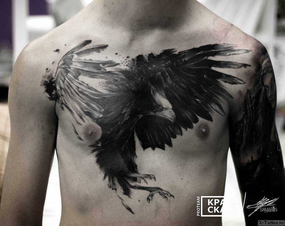 Мужчина, на теле которого изображен ворон, скорее всего, подчеркивает свою мужественность, возможность быть лидером. Для некоторых – это символ пережитой боли, утраты, страдания. Сочетание ворона и черепа может символизировать смерть, бесстрашие.