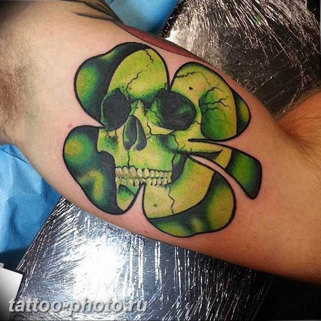 Кельтское тату с четырьмя листками клевера. Это, предположительно, наиболее распространенный тип дизайна. Татуировка может содержать некоторые особенности, такие как кельтское древо жизни или кельтский крест, которые окружают растение. По сути, тату имеет выраженную кельтскую тематику и выполняется в традиционном зеленом цвете.
