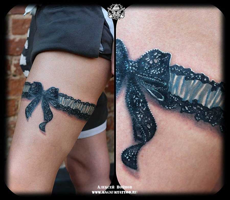 Существует большое разнообразие тату подвязка. Многие смотрятся настолько реалистично, будто потрогав, можно ощутить воздушность кружева и нежность лент. Этот великолепный стиль называется реализм. С его помощью можно придать татуировке реалистичный объем, в точности показать все мелкие детали, обрисовать тени.