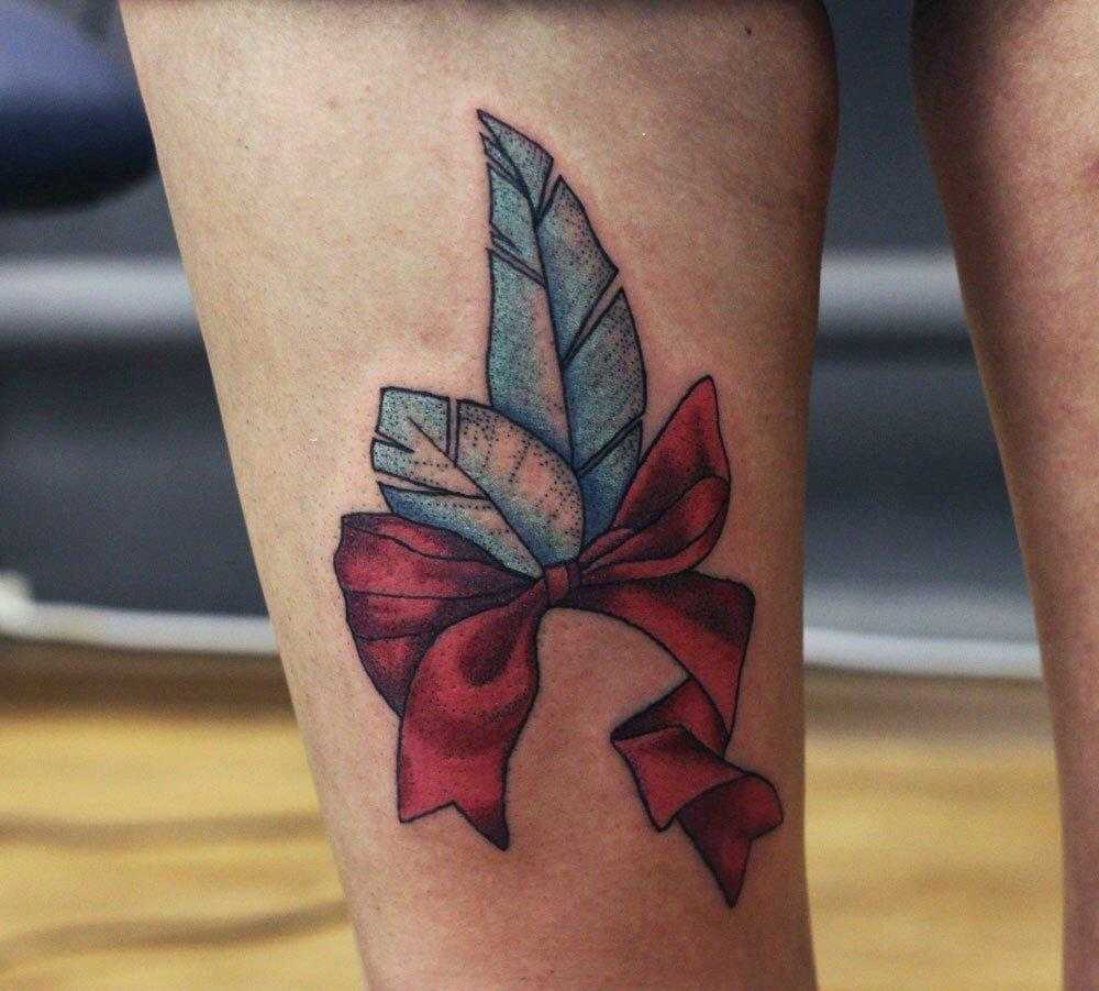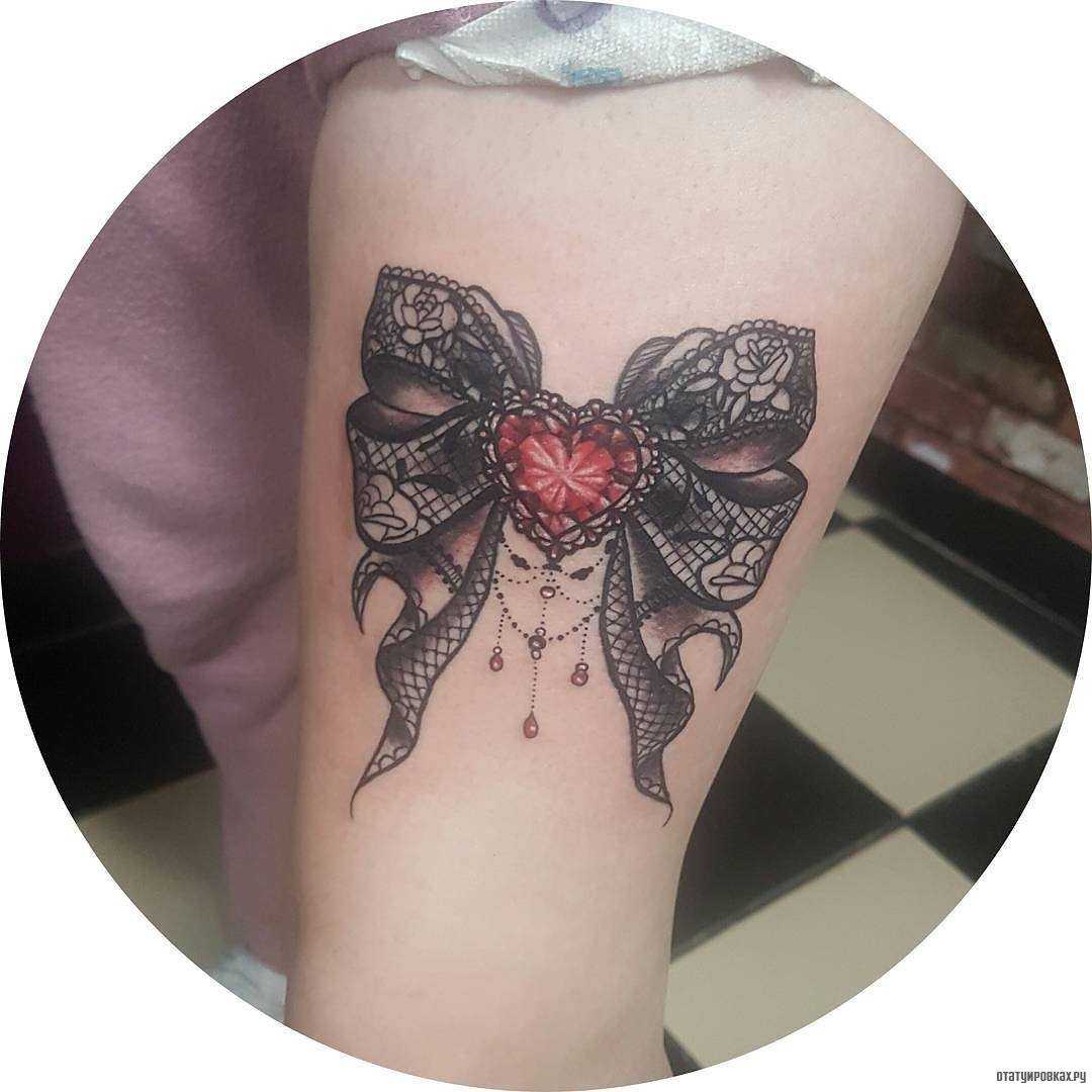 Сложно представить что-то более женственное, чем бант. Несмотря на то, что этот элемент кажется легким и ничего не обозначающим, татуировка подвязки, эскиз которой содержит эту деталь, может иметь следующие значения: