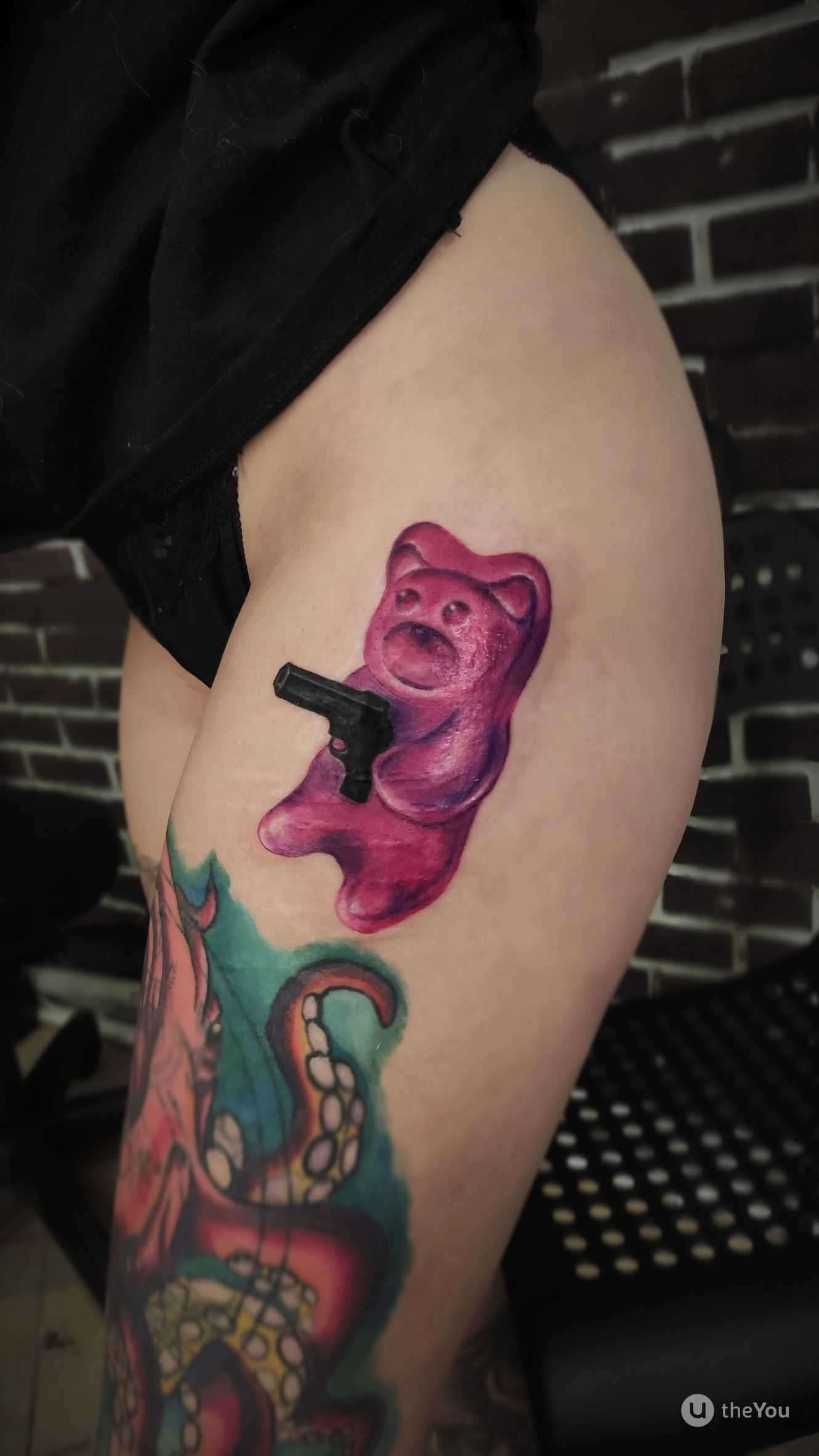 Еще древние люди знали, что красота может не только спасти мир, но и разрушить его окончательно. Как никогда такая формулировка подходит для тату повязки с пистолетом или ножом. Обладательница такого рисунка, не такая уж и беззащитная, как кажется на первый взгляд.