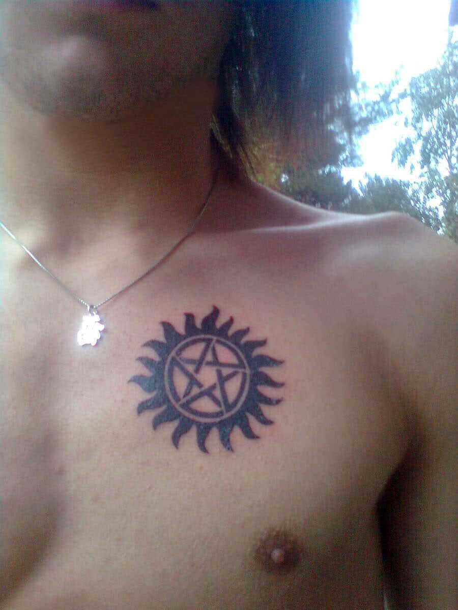 Самая знаменитая и узнаваемая тату, которую заказывают в салонах – это пентаграмма, защищающая от одержимости демонами. Этот рисунок представляет собой звезду, вписанную в круг в обрамлении языков пламени. У Сэма и Дина Винчестеров, героев сериала, она располагается в районе сердца около ключицы, но поклонники делают его и на других частях тела.