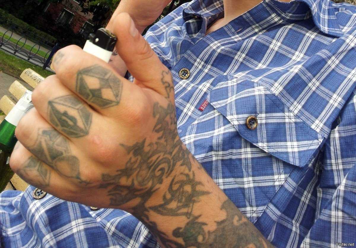 Перстни и камни. Изображение, имитирующее перстень смотрится на мужском пальце очень эффектно. Он может быть один, или совмещаться по смыслу с рисунками других пальцев. На фалангу можно нанести изображение драгоценного камня, например, бриллиант. Рисунок свидетельствует о высоком статусе его носителя. Этот человек определенно знает себе цену и умеет добиваться поставленных целей.
