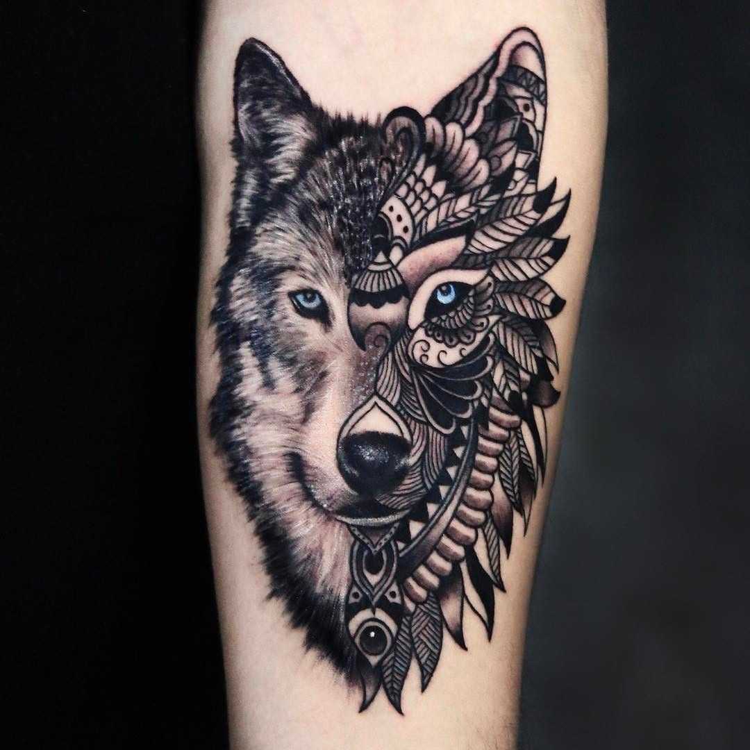 Изображение олицетворяет смелого, выносливого, мужественного, великодушного, честного, мудрого человека. Волка нередко наносится на кожу вместе с индейцем, который стоит рядом. Неплохо выглядит, когда часть морды плавным образом переходит в изображение предводителя племени.