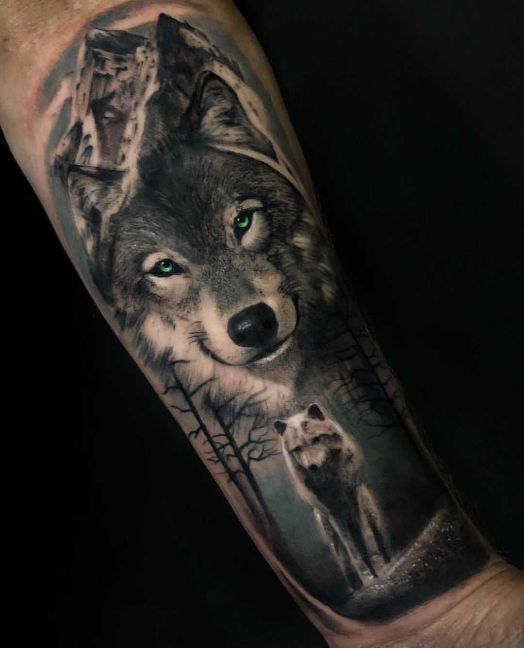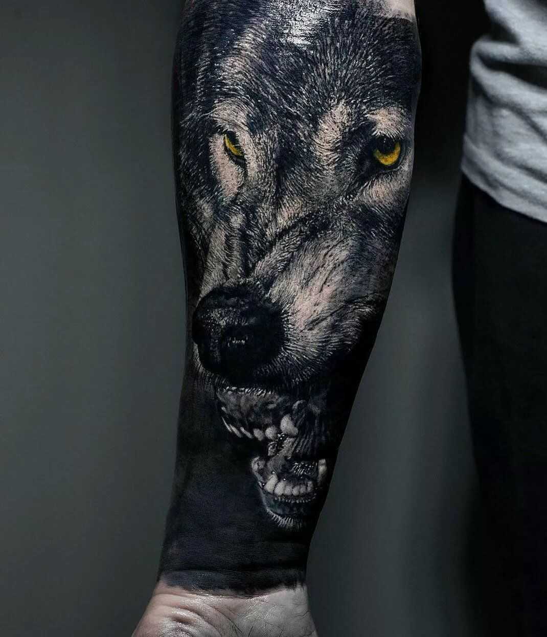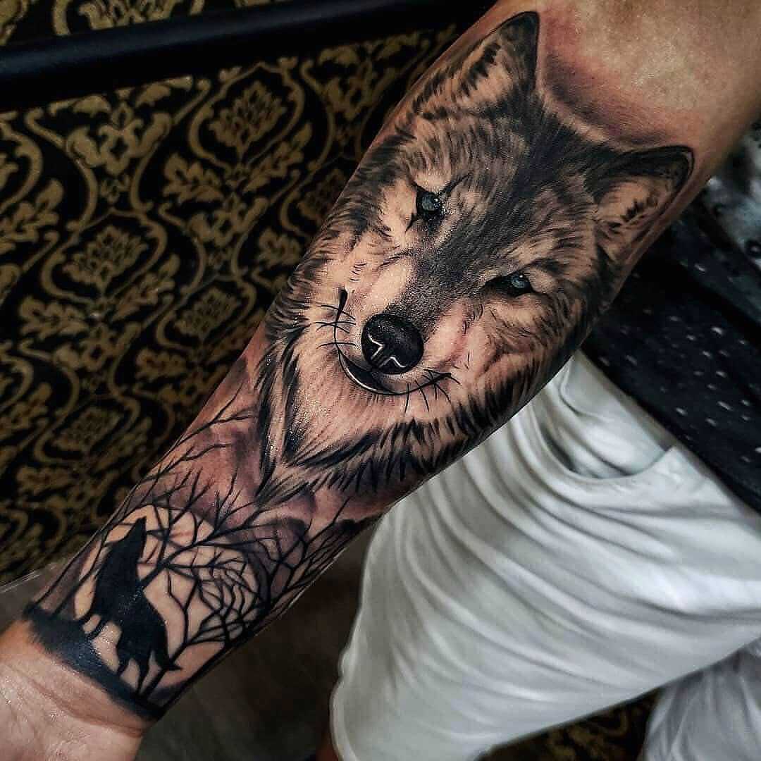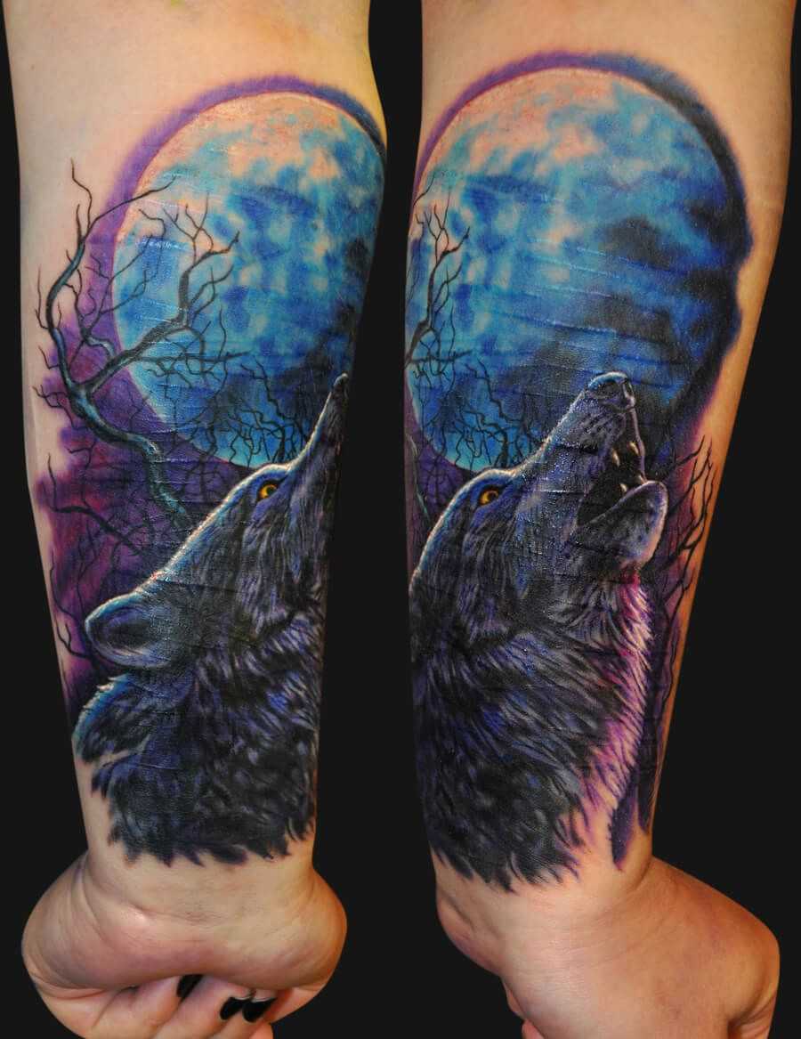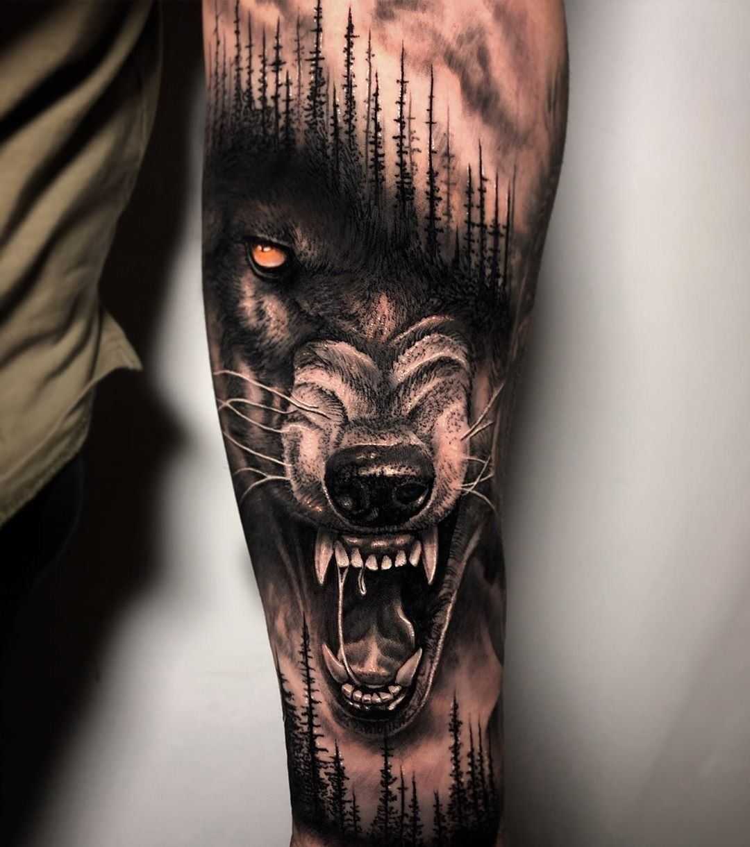 Неплохо смотрится волк на фоне леса. Изумительные тату создаются с сюжетом превращения в оборотня под луной. Носитель словно демонстрирует свое стремление подчинить себе темные стороны своего характера.