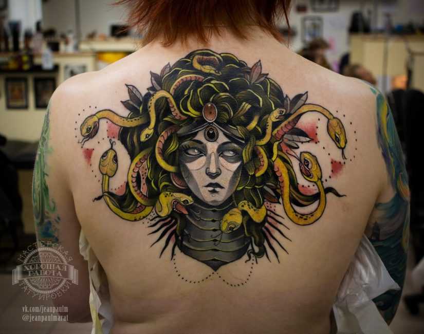 Наиболее же удачным считается рисунок, сделанный на спине, так как эта зона характеризуется устойчивостью к возрастным изменениям, большой площадью и возможностью для игры фактурой и движением.