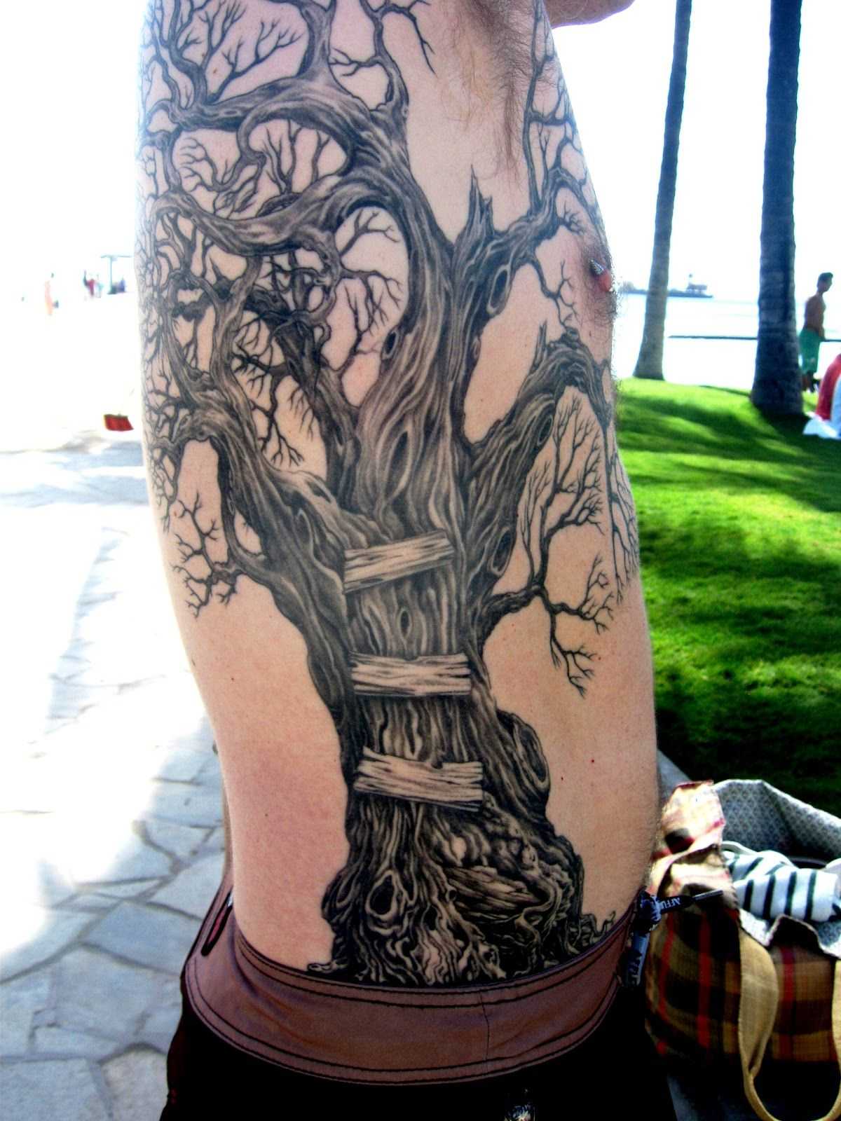 Как уже говорилось выше, дерево – универсальный рисунок для татуировки. Оно прекрасно смотрится как на мужском, так и на женском теле. К тому же, достаточно глубокий смысл делает данный символ еще более привлекательным для мира нательной живописи. Многие мужчины проводят параллель между изображением дерева и целеустремленностью. Поэтому такой рисунок отчасти способ показать свою силу и доминирующее начало. Отличные варианты для этого – дуб, ясень, тополь, клен, орех и т.д.