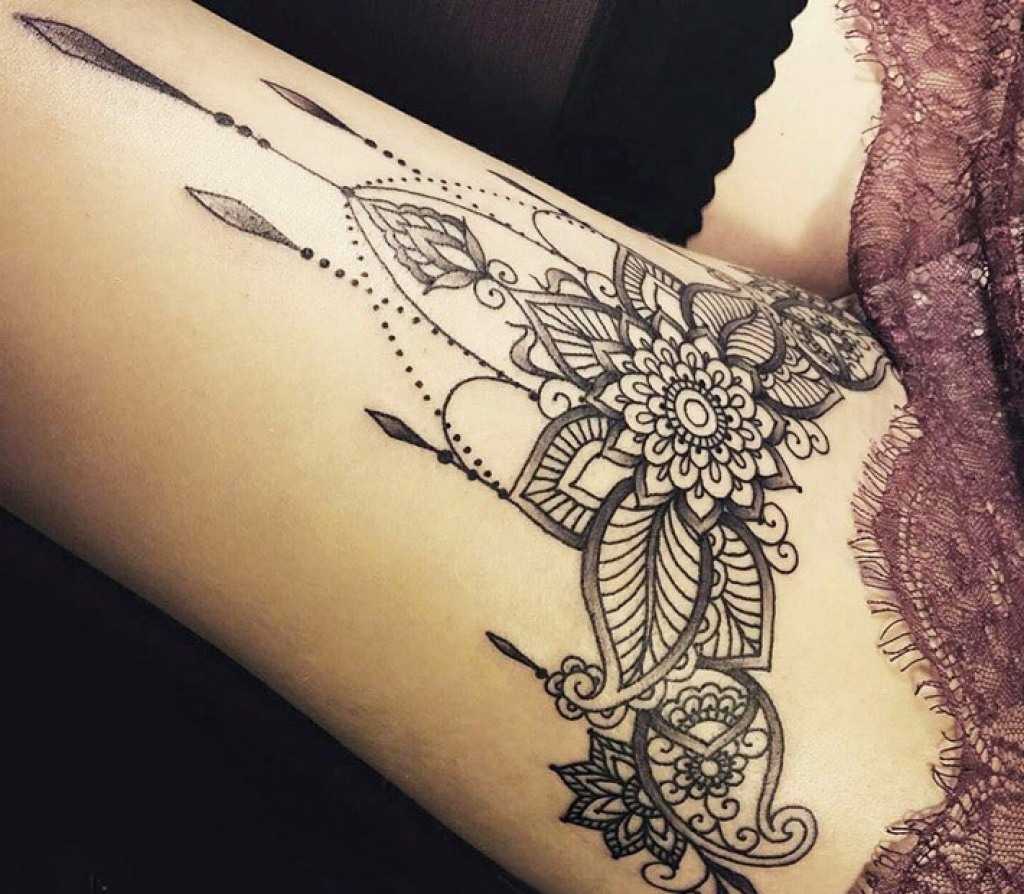 Чтобы украсить запястье может выбираться узор. Вторым по популярности идут зоны под грудью, ступня — на ноге выполняются небольшие фигурные рисунки.