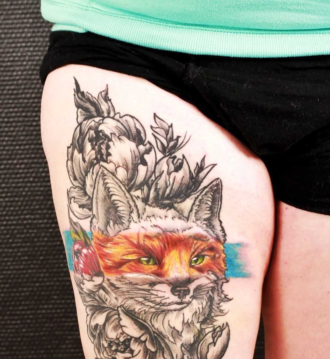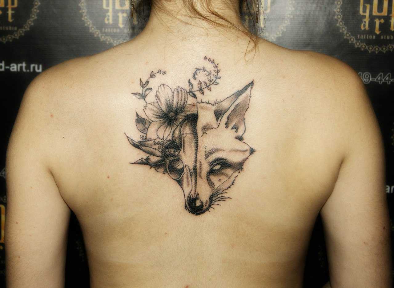 - Выполненная в реализме, или стиле нью-скул, тату лиса с цветами;
