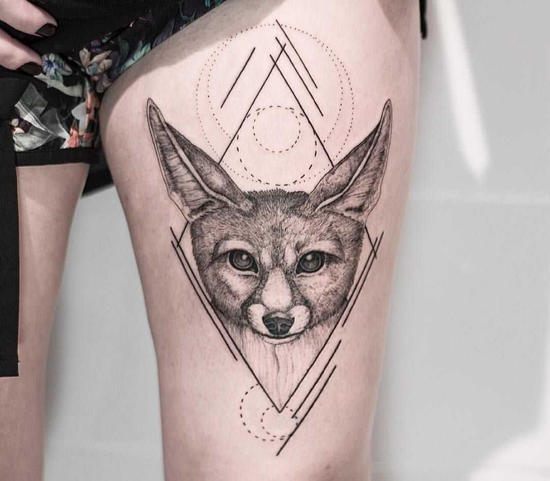 Другим необычным представителем лис является фенек. Это небольшое животное с большими ушами, живущее на севере Африки. Фенек символизирует оригинальность, выносливость, способность адаптироваться даже в сложных обстоятельствах. В татуировках он встречается не часто, однако, из-за своих качеств и причудливого вида может стать прекрасной идеей для маленькой женской тату.