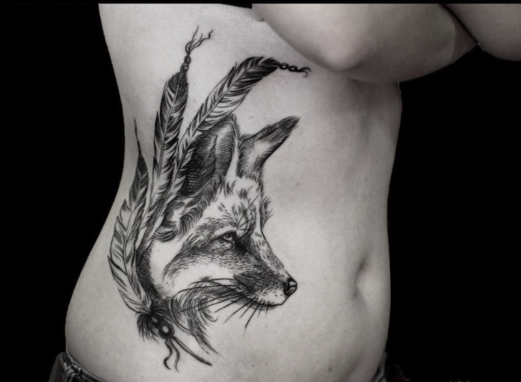 Изобразить лисицу можно по-разному. И речь здесь не только о стилях, но и о разных деталях. Если это отсылка к индейцам и шаманизму, то часто рядом с головой животного рисуют перья, другие атрибуты традиционной культуры. Иногда лисья голова изображается в виде маски.