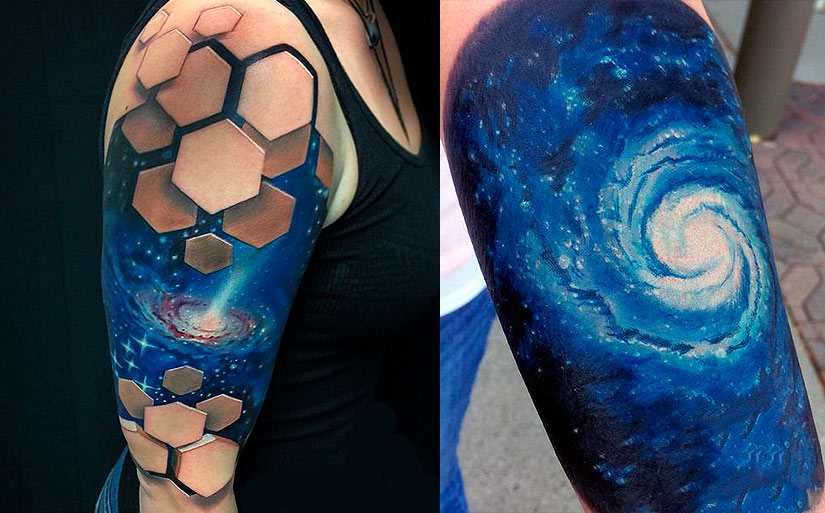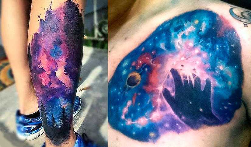 Следующий вариант – татуировка вселенная. Сложный, масштабный рисунок. Часто его создают без отсылок к реально существующим космическим объектам.