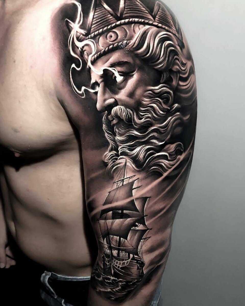 Одна из самых популярных тематик для мужской татуировки на плече. Различная стилистика выполнения позволяет добиться самого разного эффекта. В сочетании с прочими элементами тату череп может смотреться романтично, зловеще, нейтрально.