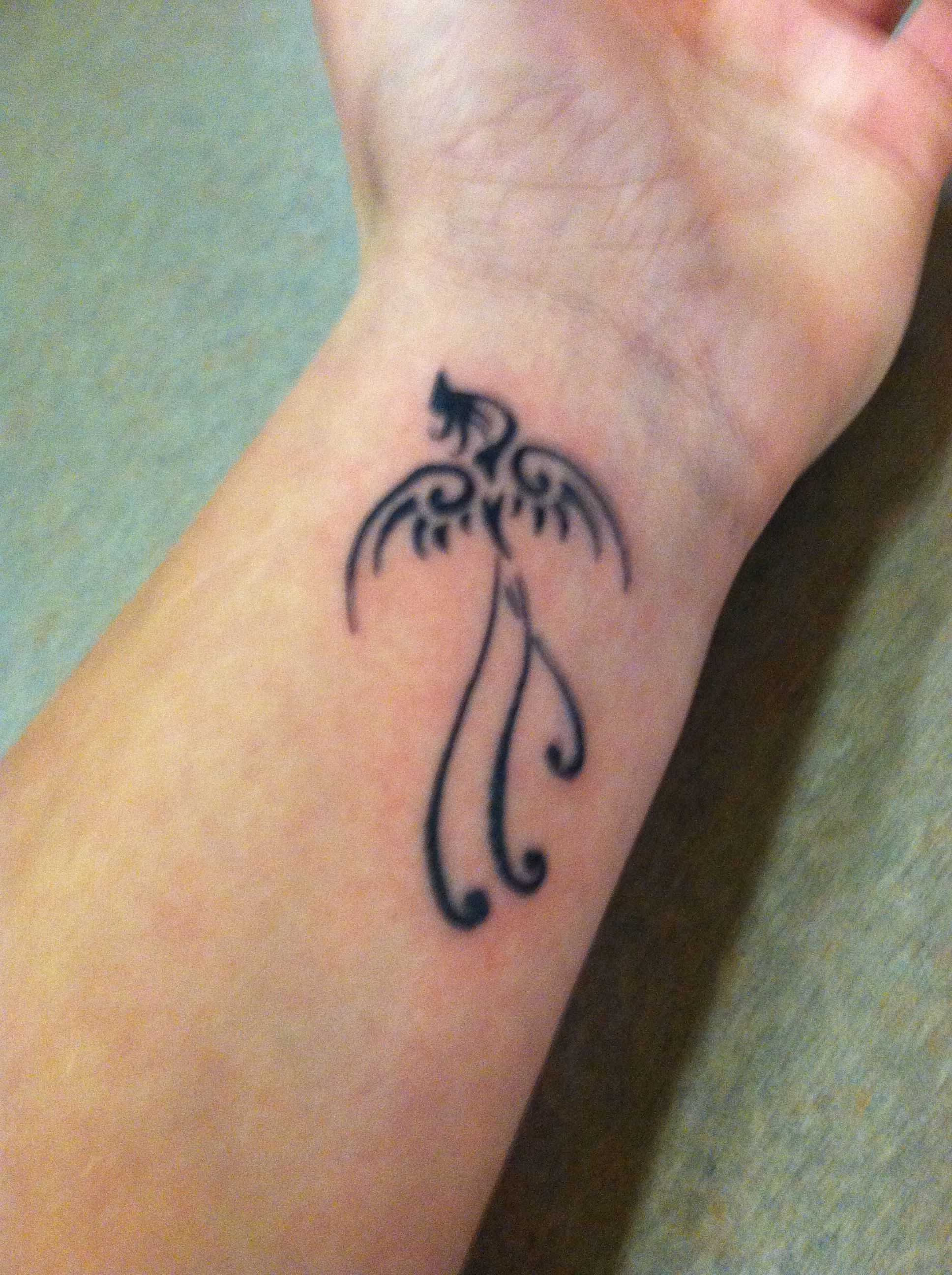 - Тату феникс на запястье – это знак великодушия, милости и благодати. Рука с фениксом воспринимается как символ помощи и дарения.