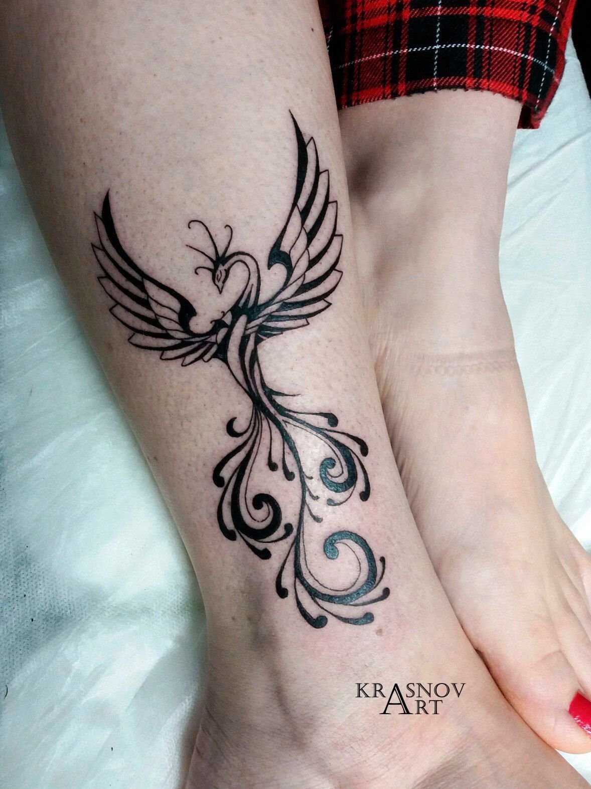 Изображение жар-птицы таит глубокое значение для девушек. Птица феникс взяла своё начало в древнегреческой мифологии. По легенде существу была дарована долгая жизнь. Когда цикл жизни птицы подходил к концу, она совершала самосожжение и перерождалась. В отличие от других татуировок, изображение существа для женщин несёт глубокий смысл. Обозначения рисунка различны. Большинство набивают тату, олицетворяя существо с защитным оберегом или с символом силы и возрождения. Возможно, человек делает татуировку, чтобы словно феникс, возрождаться после серьёзных жизненных ситуаций и напоминать себе, что после «смерти» наступает перерождение. Другими словами, какие бы не происходили тяжёлые эпизоды в жизни, после них, со временем, становиться легче.
