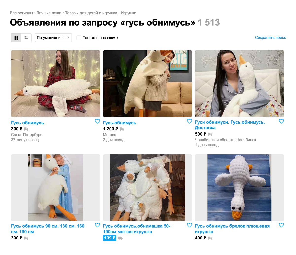 В Челябинске гусь и вовсе обогнал по популярности на «Авито» другие игрушки — акулу из «Икеи», сову с пледом и кота Батона. В декабре 2022 года птицу покупали в три раза чаще, чем в предыдущем месяце.