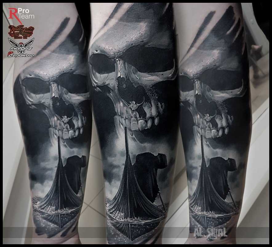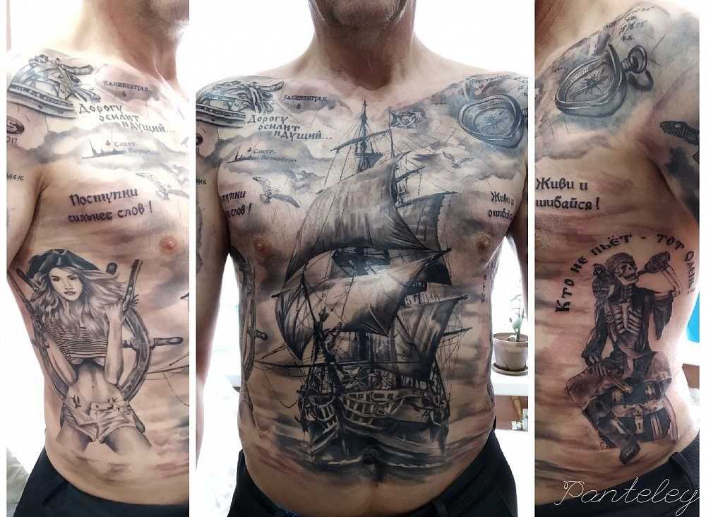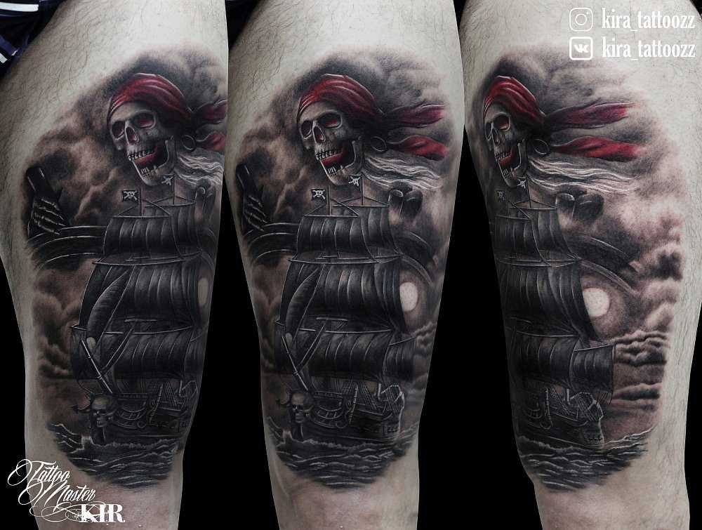 Ещё один мейнстримный, но от этого не менее классный вариант – тату корабль Черная жемчужина, на котором плавал капитан Джек Воробей. К слову, это единственное судно в фильме, которое было построено на самом деле, не являясь декорацией, или частью спецэффекетов.